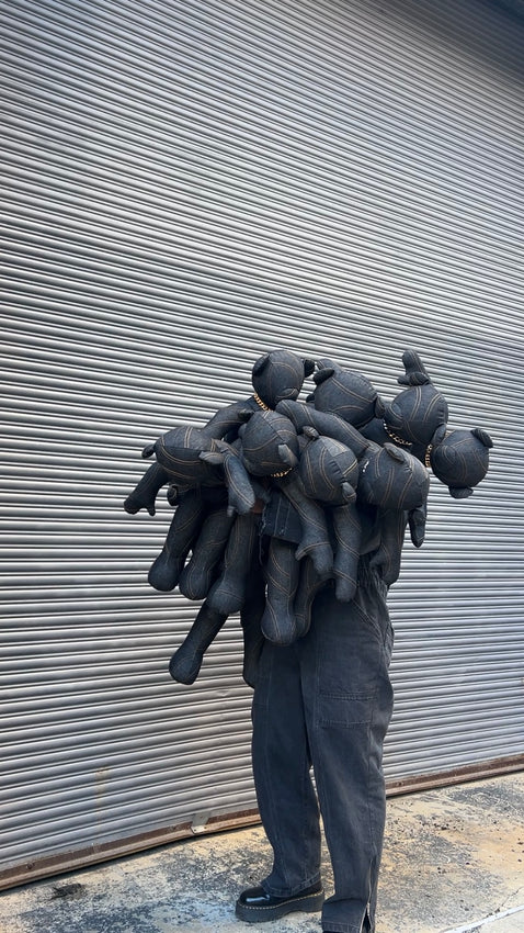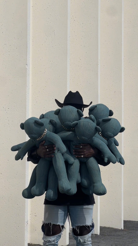 Indigo denim shell with gold swirl motifs. Polyester stuffing.